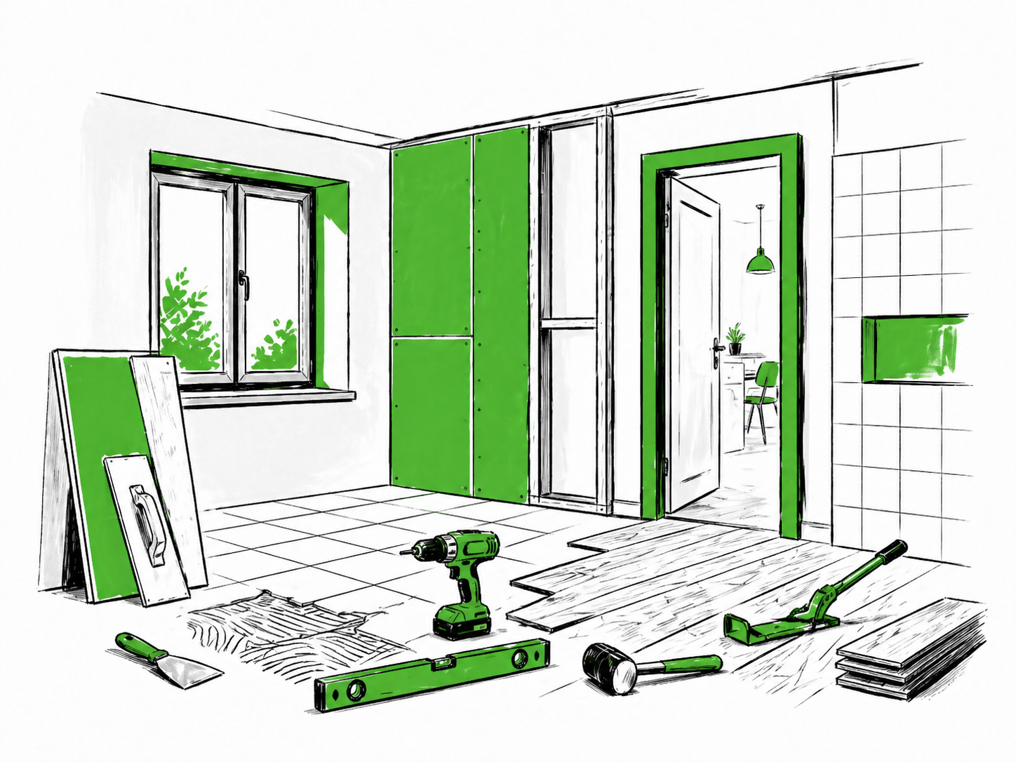Vom Einbau von Fenstern und Türen über Fliesenlegearbeiten und Trockenbau bis hin zur Verlegung von Parkett und Böden decken wir alle Arbeiten im Innenbereich ab.